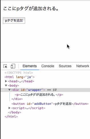 ボタンを押すと、id属性 に wrapper という名前をつけたdivタグの子要素として、新しくpタグが追加されます。