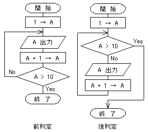 「ループ端」には終了条件を記入する。左図のフローチャートでは、A>10(Aが10より大きければ繰返し終了)である。