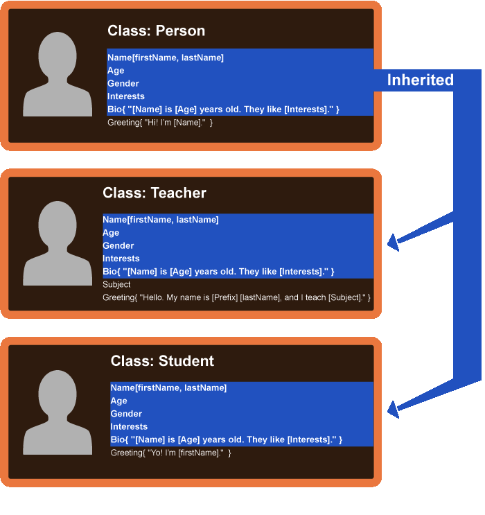 このケースで求めているのは、包括的な人物ではなく、より特定のタイプである、教師と生徒です。OOP では、他のクラスを元にした新しいクラスを作ることができます。これらの新しい子クラスは、親クラスからデータやコード機能を継承することができ、すべてのオブジェクトタイプに共通する機能を、重複させるのではなく、再利用することができます。クラス間で機能が異なる場合は、必要に応じて特殊化された機能を直接定義することができます。