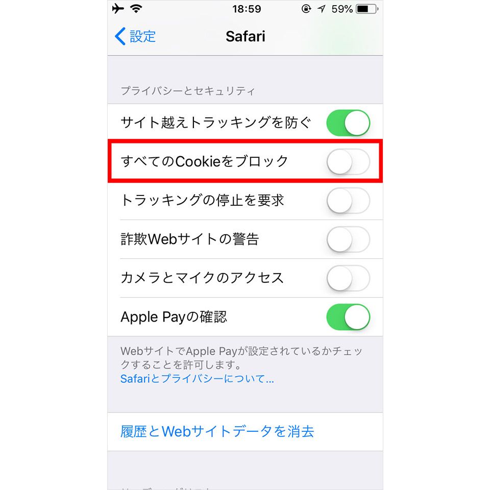 また、Internet Explorer 11の場合は、「ツールボタン」>「インターネットオプション」>「全般」から「削除」ボタンをクリック。次の画面で「cookieとWebサイトデータ」にチェックを入れ、「削除」をクリックすればOK。Macのsafariは「履歴を消去」のメニューからcookieを削除できる。iPhoneの場合は、「設定」から「Safari」>「詳細」>「Web サイトデータ」>「全 Web サイトデータを削除」の順にタップするとcookieが削除できる。