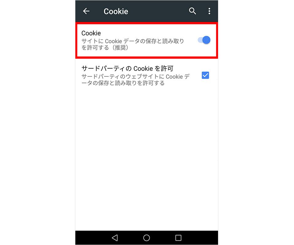 AndroidのChromeアプリでは、Chromeを開いたら、右上にあるその他アイコンから「設定」>「サイトの設定」>「cookie」と進み、そこでcookieを有効にするを選択すればOK。