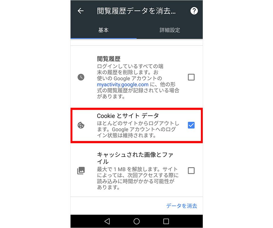 cookieを削除するには、Chromeの場合は、「設定」画面で「閲覧履歴データを消去する」をクリックして表示されたウィンドウで「cookie とサイト データ」にチェックを入れ、「データを消去」のボタンを押せばいい。AndroidのChromeでcookieを削除するときも手順は同じだ。